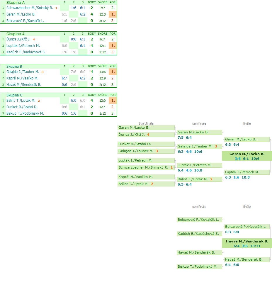 Štvorhru sa podarilo vyhrať novovytvorenej dvojici Garan/Lacko nad prekvapením turnaja Lupták/Petrech. Útechu vyhral domáci pár Havaš/Senderák.